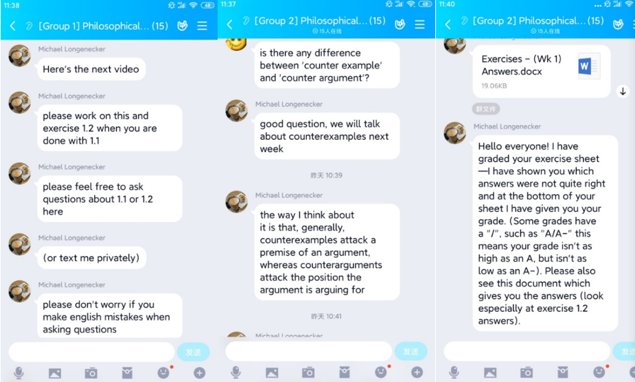 色情导航 的Michael·Longenecke博士后则是担任了《专业外语》(外国哲学、伦理学、科哲和宗教学方向)的教学工作。Michael老师每节课前会发布几个问题,问题大都是涉及到当天的课程内容,在课后要求学生们结合所学内容提交解答,Michael老师也会给出相应的批改,并且每周还有一次小测试。同学们都觉得这样的授课形式令自己收获颇多,更加专注地投入到学习中去。