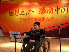 【事迹】18岁的黄舸看上去像个十一二岁的孩子。7岁时,他被确诊为先天性进行性肌营养不良。据专家介绍,同类患者最长生命纪录仅为18岁。 黄舸的生命也许就要走到尽头,但是为了能面对帮助过他的人说声谢谢,2003年,15岁的黄舸和父亲用一辆三轮摩托车踏上了“感恩之旅”,开始在全国寻访素未谋面的恩人。如今,父子俩已经走过了82个城市,行程1.3万多公里,向30多位当年给他们寄过钱的恩人当面道了谢。父子俩一路上感受着感动,也传播着感动。 黄舸说:“到好心人的家门口说声谢谢,送上一束鲜花表达深深的谢意,是我最大的心愿。”这个心愿一直支持着他走到今天。如果有一天离开人世,黄舸希望把自己的眼角膜捐给需要的人。