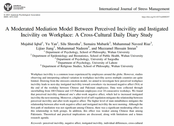 其次,严瑜教授与其博士研究生Mujahid Iqbal进行了一项组织不文明的跨文化研究,在国际心理学SSCI期刊《International Journal of Stress Management》发表文章“A Moderated Mediation Model Between Perceived Incivility and Instigated Incivility on Workplace: A Cross-Cultural Daily Diary Study”,深入探究了职场不文明行为作为一种重要的人际压力源,在感知工作场所的不文明行为与煽动不文明行为之间的关系与机制,以及存在的文化差异。团队调查了中国和巴基斯坦的员工,发现员工在感知不文明行为、下班后的负面情绪、次日早晨煽动的不文明行为以及人格特征/状态等方面存在文化差异。对中国和巴基斯坦员工来说,感知到不文明行为会导致员工工作日结束时的负面情绪增加,进而提高次日早上对同事煽动不文明行为的频率,同时对于那些高水平自我调节能力的员工来说,这种可作用路径的影响更小。但是,巴基斯坦人的结果比中国人更显著,具体来说,巴基斯坦员工在感知不不文明、负面情绪、煽动不文明和自我调节方面的总体得分高于中国员工,中国员工的状态正念得分更高。这些发现表明,作为日常负性事件的职场不文明行为必须通过调节来缓解,特别是对于具有某些人格特征 (如低自我调节能力和低状态正念水平)的人。