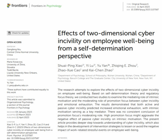 首先,严瑜教授及其博士研究生肖帅萍以及美国霍普金斯大学的Zhiqing Zhou教授共同关注了组织不文明的线上表现形式,在心理学SSCI期刊《Frontiers in Psychology》发表了学术论文“Effects of two-dimensional cyber incivility on employee well-being from a self-determination perspective”,深入探讨了职场网络不文明对员工情绪耗竭的影响,试图提供更多关于二维职场网络不文明是否以及如何影响员工幸福感的见解。基于自我决定理论和调节定向理论,通过情境实验和时间滞后两项研究,考察了主动和被动的职场网络不文明行为影响情绪耗竭的即时和延时效果及其内在机制。研究揭示了二维职场网络不文明相似的作用机制,证明了主动和被动职场网络不文明对员工情绪耗竭的消极影响,内在动机是重要的中介因素。然而,究竟主动和被动网络不文明哪个的作用更强?答案不是唯一的,主动职场网络不文明可能表现出更强的即时效应,但被动不文明的消极影响具有纵向持续性。纳入时间因素的考察会得到更全面的答案,这也反映了它们在作用机制上的潜在差异。该研究强调了职场网络不文明的重要性,并呼吁学者们采取更广泛的视角对职场网络不文明进行深度研究。