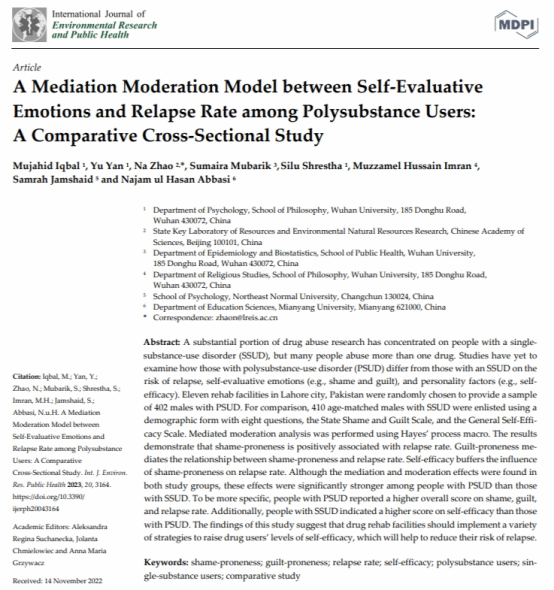 另外,严瑜教授的研究团队关注了物质使用障碍群体的偏离行为和消极情绪,在国际健康心理学SSCI期刊《International Journal of Environmental Research and Public Health》发表文章“A Mediation Moderation Model between Self‐Evaluative Emotions and Relapse Rate among Polysubstance Users: A Comparative Cross‐Sectional Study”,分析了多物质使用障碍(PSUD)群体与单一物质使用障碍(SSUD)群体在复吸风险、自我评价情绪(如羞耻和内疚)和人格因素(如自我效能感)方面有何不同。结果显示,羞耻倾向与复吸率呈正相关,内疚倾向在羞耻倾向与复发率之间起中介作用,自我效能感缓冲了羞耻倾向对复吸率的影响。虽然在两个研究组中都发现了中介和调节作用,但PSUD患者的中介和调节作用明显强于SSUD患者。更具体地说,患有PSUD的人在羞耻、内疚等方面的负面情绪和偏离行为表现更突出。此外,SSUD患者在自我效能上的得分高于PSUD患者。这些研究结果表面摆脱物质成瘾应该采取多种策略,提高成瘾者的自我效能感。