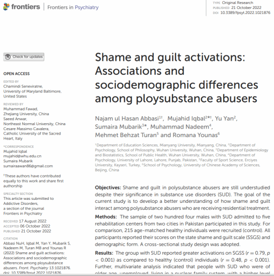最后,严瑜教授等人的研究深入探索了职场中物质滥用者如何激活他们的羞耻感和内疚感,从而阻止职场偏离行为的发生。在国际健康心理学SSCI期刊《Frontiers in Psychiatry》发表文章“Shame and guilt activations: Associations and Sociodemographic Differences among Ploy-substance Abusers ”,本研究是为了更好地理解羞耻感和内疚感与多物质滥用者之间的关系。来自中国和巴基斯坦两个城市的五个康复中心的204名多物质滥用的男性样本参与了这项研究。为了进行比较,招募了215名年龄匹配的健康个体作为对照组。全部的参与者报告了他们在羞耻感和内疚感量表(SSGS)和人口统计表上的得分。采用了横断面研究设计。研究结果表明,羞耻感和内疚感的激活与多物质滥用之间存在关联。这些结果表明,多物质滥用者可能会从心理治疗干预中受益,以避免对其物质使用感到羞耻和内疚。