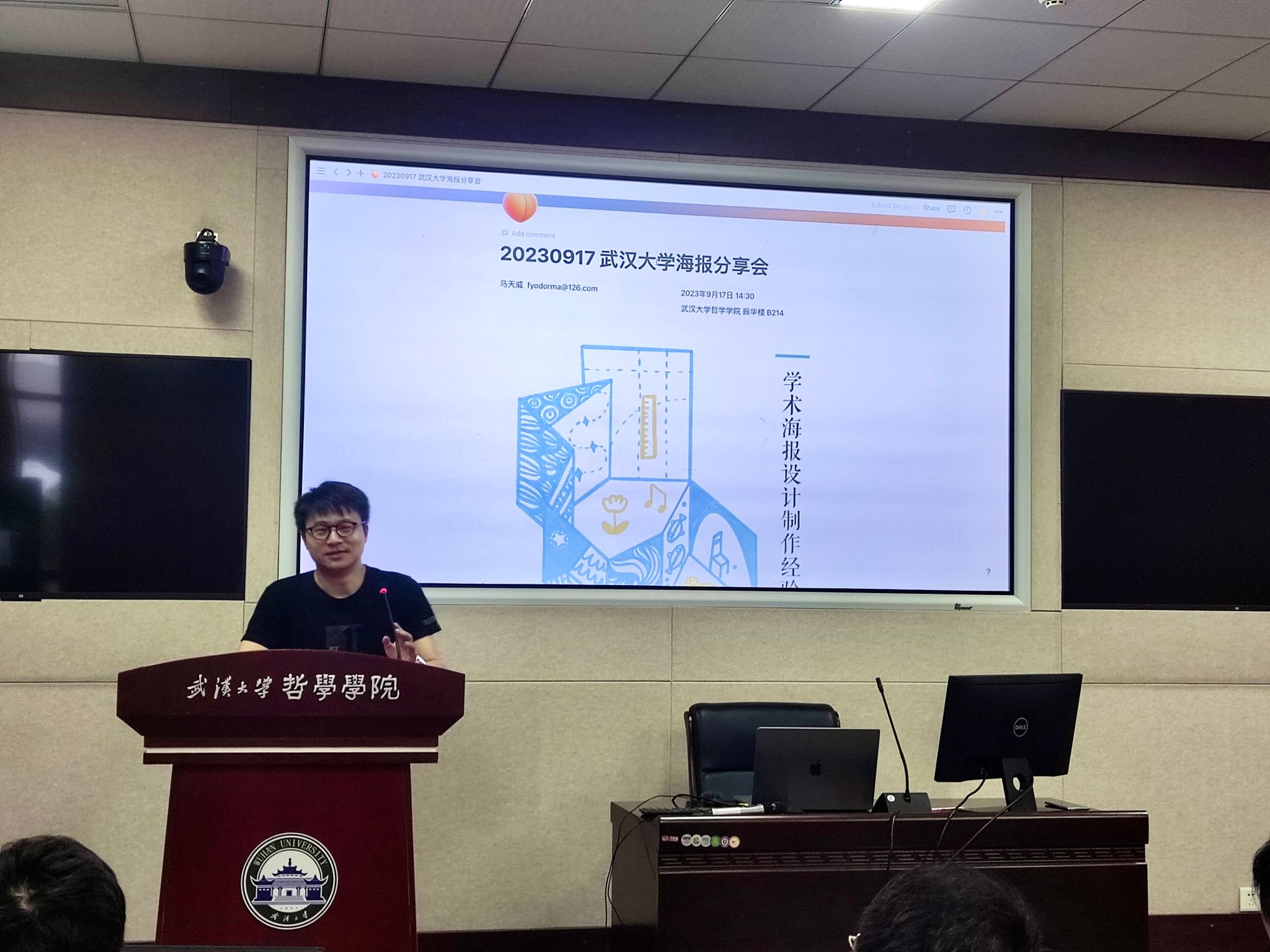 分享会开始,曾长期担任北京大学文研院海报设计助理、北京大学未名BBS美工站务,并荣获香港当代设计奖的马天威老师为大家展示了丰富的学术海报设计案例,将海报设计的主要内容分为:理解题目与整理信息、版式设计、配色、字体四个板块。