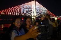走出充满故事的船舱,登上顶层甲板,历史的余韵仍未散去,璀璨灯光与粼粼波光却立刻吸引了大家的目光。两江四岸开学季主题灯光秀,向新生们发出了“莘莘学子 扬帆起航”“你好大学生”的热情问候。