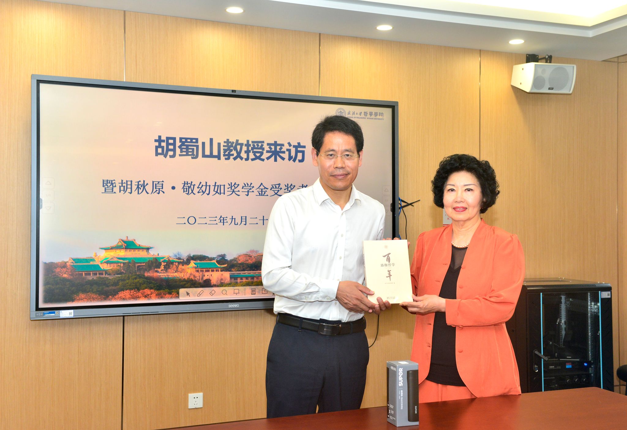 李佃来院长向胡蜀山教授介绍了学院近年来的发展情况,指出“胡秋原·敬幼如奖学金”的设立,激励了学院在人才培养上取得了一定成效,并表示,学院将会继续发扬胡秋原先生的风骨,一如既往地专注于人才培养。会上,李佃来院长向胡蜀山教授赠送了《珞珈哲学百年》一书。