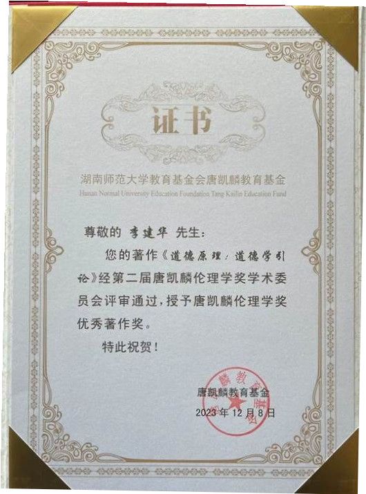 色情导航 李建华教授著作《道德原理——道德学引论》荣获第二届唐凯麟伦理学基金优秀著作奖