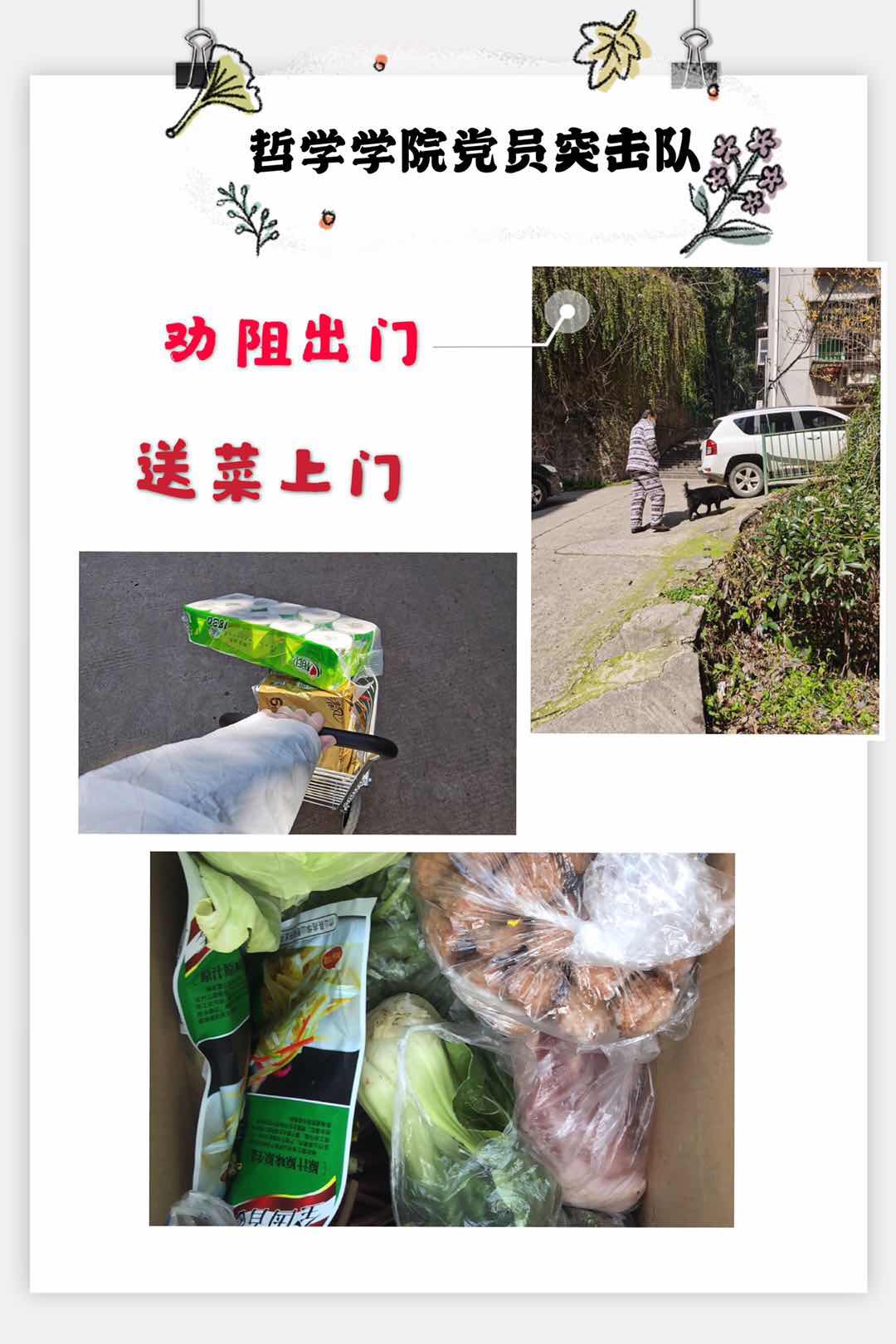 党员突击队高度重视疫情期间离退休老同志的帮扶工作。突击队队员坚持每天详细了解离退休老同志的身体状况,关心他们的生活情况,了解他们的生活困难和需求并予以及时有效的解决。他们为离退休老同志奔波的脚步从未停止,有的为高龄老人送菜到家,有的为独居老人送蔬果、丢垃圾,有的到校医院为生病的老人取药,有的为不会网购的老人线上团购……他们的工作得到了离退休老同志的一致好评与认可。