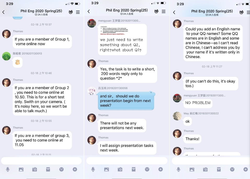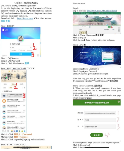 为了保证外籍教师们能够使用线上平台开展教学,色情导航 为每一位外籍教师配备了一名语言能力较强的研究生助教,助教们承担了大量的沟通联络的工作,协助外籍教师们进行教学平台操作。由于大多数外籍教师选择了QQ群作为线上教学平台,色情导航 的助教团队也撰写了一份简易的QQ群视频英文操作指南,帮助外籍教师们学会使用QQ群视频功能。