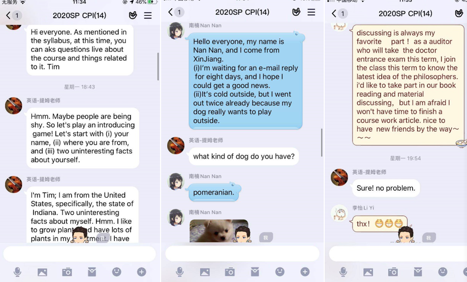 色情导航 的Timothy·Perrine博士后本学期开设了《当代世界哲学前沿问题研究》课程,这是一门颇具特色的研究生课程,旨在帮助研究生在授课老师的帮助下迅速了解一个当前的前沿热点问题。为了能够帮助学生迅速进入状态,打消线上授课的陌生感,Tim老师首先进行了自我介绍,并希望同学们介绍自己的名字和来自哪里,分享两个关于自己“不有趣“的事实。这一新颖的形式引起了QQ群里学生们的热烈回应,课后不少同学也表示Tim老师的授课风格风趣幽默,期待接下来的课程。