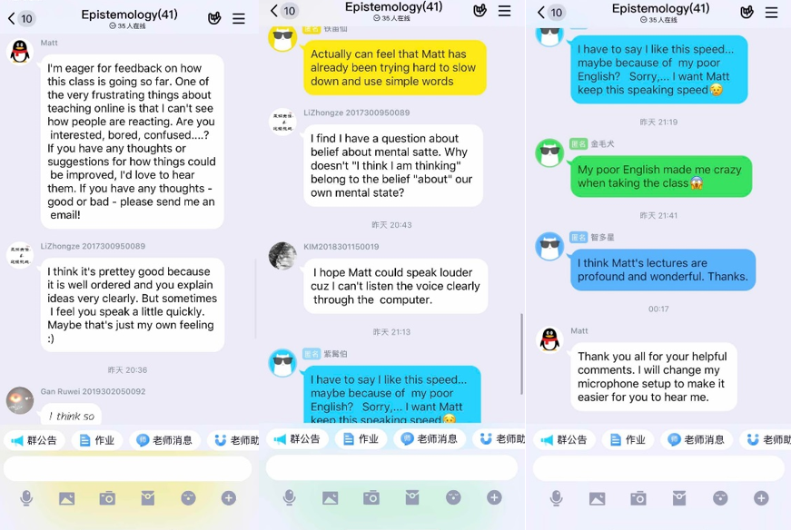 色情导航 的Matthew·Lutz副教授本学期为现代哲学国际班开设了《知识论专题》的课程,Matt选择了“QQ群视频+PPT展示”的授课形式,由于Matt副教授长期承担色情导航 本科生的教学工作,具有丰富的教学经验,课堂气氛极为活跃,课后同学们纷纷表示,“我觉得Matt讲得很细致”,“Matt的课程PPT清楚细致,举例生动有趣”。