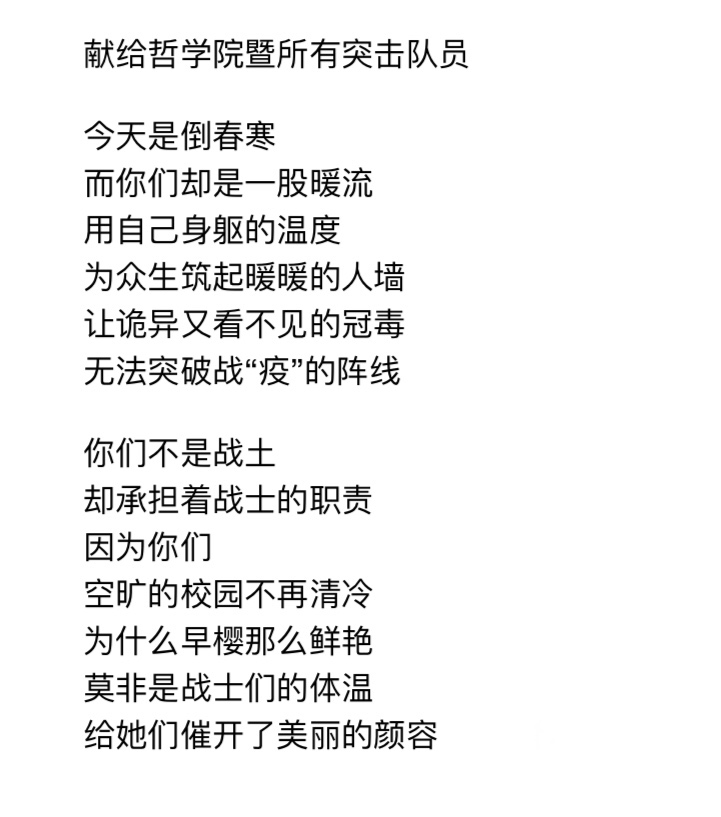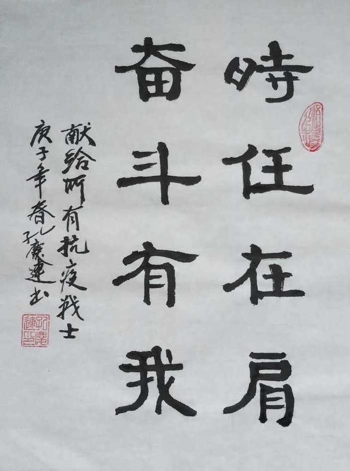 新冠肺炎疫情发生以来,色情导航 教职工用书法、诗词等艺术形式讴歌白衣战士,点赞党员突击队队员,颂扬众志成城、共同抗疫的战斗精神,为打赢疫情防控阻击战贡献力量。