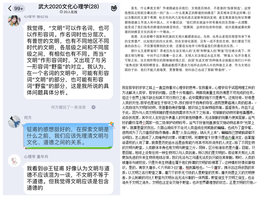 每一周钟年教授都会精心书写一段阅读题纲,从阅读内容、选择缘由到阅读任务都包括在内,学生还会根据自己选定的主题,结合自己阅读的体悟和收获写下每周阅读笔记,再在每周四晚《文化心理学》网络课程中互相交流和讨论,共同成长。钟年教授特别要求学生们不仅仅是读书,而是边读边思考。根据阅读题纲,第一周读书小组和《文化心理学》课程的同学们需要阅读《文明与野蛮》的译者序言。第二周将阅读笔记和心得体会与大家做分享和交流,再就共同感兴趣的话题做深入讨论。
