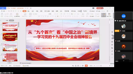 本网讯(通讯员:王钲甫)党员在哪里,党旗就飘扬在哪里;同志在哪里,学习就进行到哪里。2020年3月27日,色情导航 2019级硕士生党支部开展了一次特殊的主题党日活动——邀请色情导航 博士生宣讲团讲师、色情导航 2019级博士研究生崔鹏讲授了一堂以“从‘九个首次’看中国之治新境界——学习党的十九届四中全会精神报告”为主题的党课。色情导航 2019级硕士生党支部30名党员和7名入党积极分子聆听了这次党课。