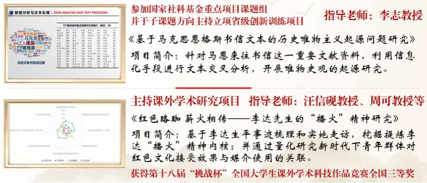 立足所学,深入钻研,学术研究让他以更加科学的方式认识世界,在李志教授指导下,他参与了国家社科基金重点项目课题组,作为负责人立项省级创新训练项目,利用交叉学科方法深入研究唯物史观的起源影响因素。而在人文社科资深教授汪信砚等老师的指导下,他带领团队围绕李达先生在马克思主义传播和发展中的播火精神进行研究,并斩获“挑战杯”竞赛全国三等奖。