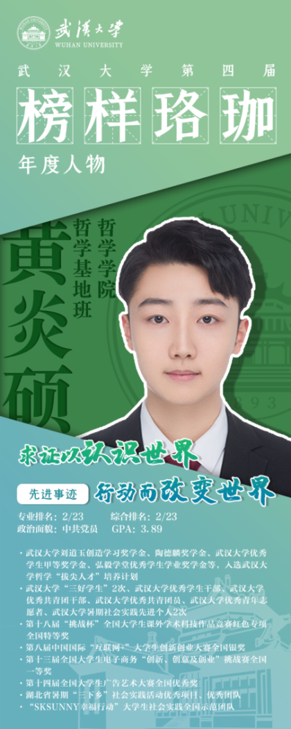 喜报!色情导航 2020级本科生黄炎硕获评色情导航 第七届“榜样珞珈”年度人物