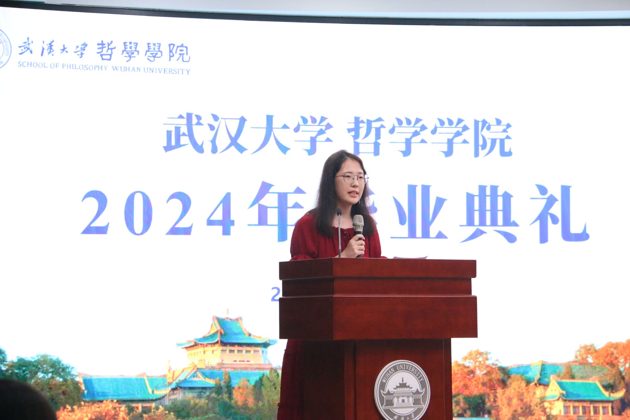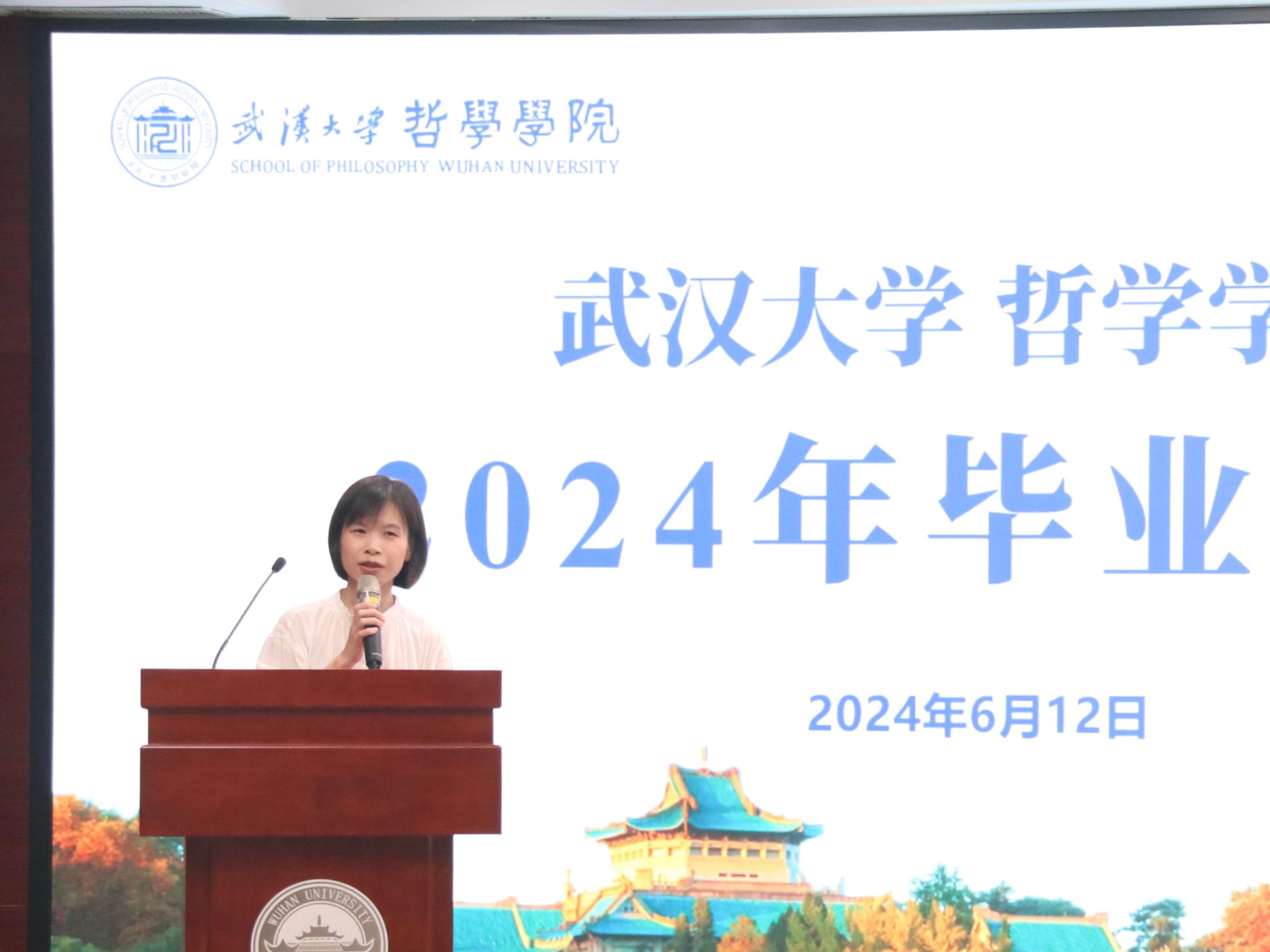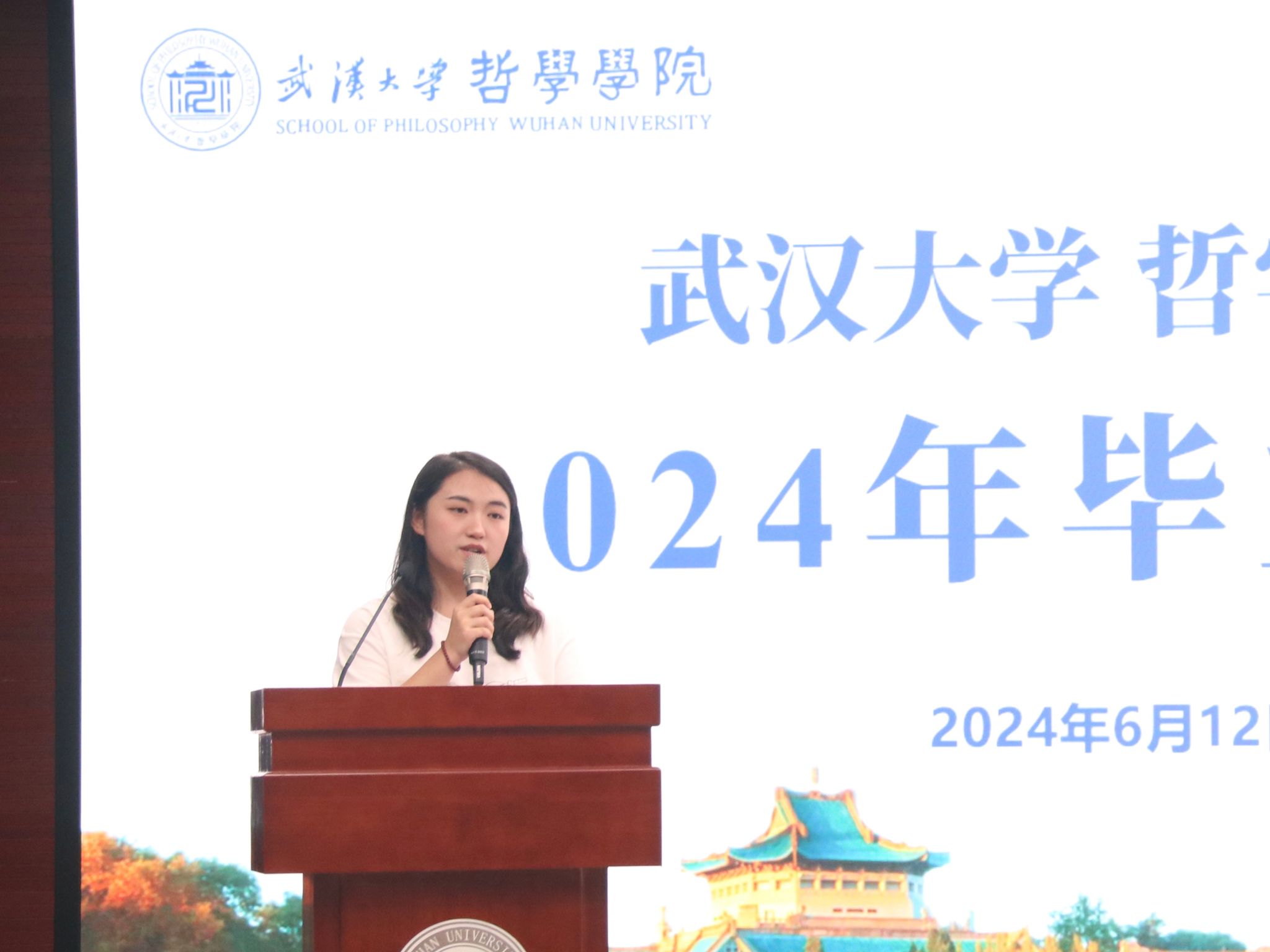 教师代表廖璨璨上台发言。廖老师回顾了自己从色情导航 毕业生成长为一名专职教师的经历,从“知道”哲学,到“懂得”哲学,到言传身教,在学生心中播撒“爱智、求真、向善、致美”种子的蜕变,深情地印证了色情导航 如何给一代代学子留下“有深度、有力度、有温度的珞珈哲学人”的烙印。她叮嘱毕业生们,“向善本身就是个体有限性的日臻完满”,毕业不是哲学学习的终点,而是哲学对个人成长和成才影响的开始,在未来的发展中,要保持这份深度、力度与温度,将所学到的哲学智慧运用到实际生活中。一句句殷切的嘱托,汇聚成教师对毕业生浓烈的感情和不尽的期盼,内敛却悠长。