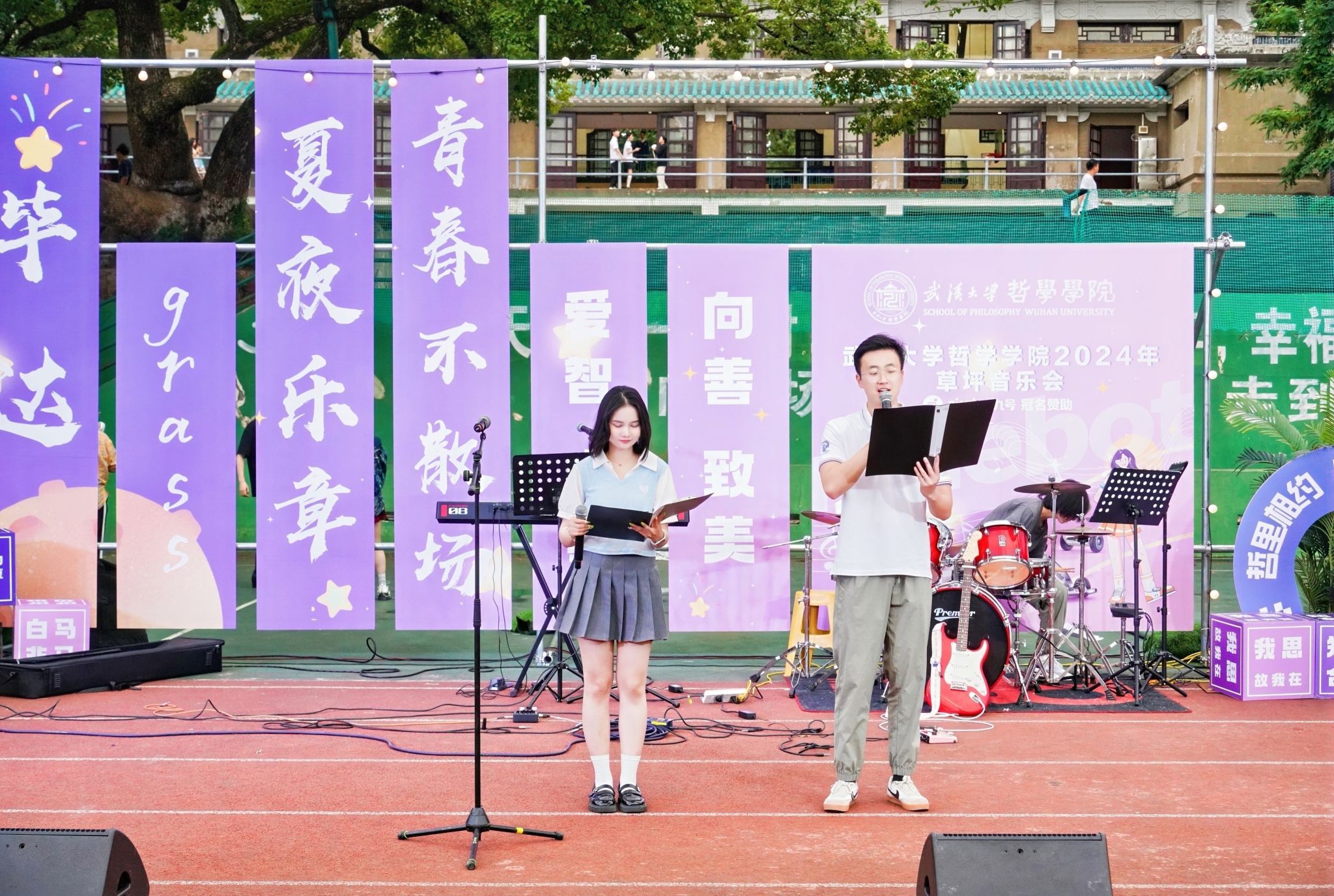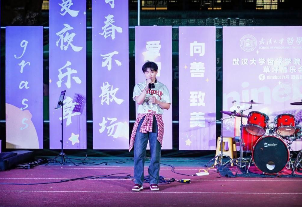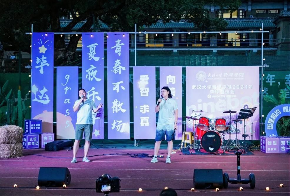 本次草坪音乐会由2022级美学专业硕士研究生陈博通和2020级哲学专业本科生张滢共同主持。整场音乐会分为“最美的祝福”、“重现的时光”、“干杯珞珈少年”三个篇章,用合唱、乐队演出、现场演绎等丰富的舞台形式,共同演绎了一场精彩的视听盛宴。整场音乐会情感丰沛,高潮迭起,同学们共同参与,释放着青春的活力,每一曲都仿佛在诉说着对母校的深深留恋之情。