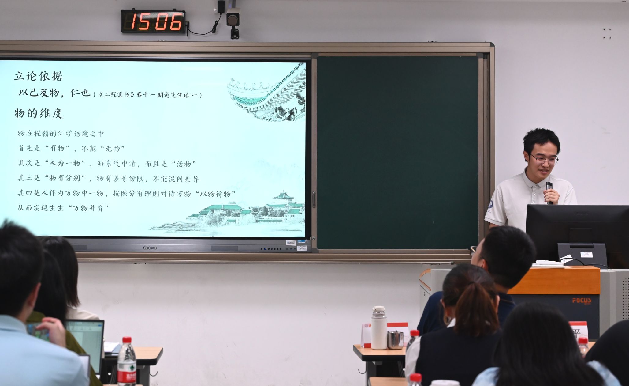 第二场报告由厦门大学哲学系王凯立老师主持。色情导航 2022级哲学强基班曹承冠同学以《及物言仁:程颢仁学中“物”的维度》为题进行报告,厦门大学岳思翰同学点评。该论文以本体论下的“物”为视角,依托“一体”“知觉”与“生生”三重诠释维度,以“浑然与物同体”的命题为切入点重审程颢仁学,旨在突破传统“一体-知觉-生生”框架中“物”的附属地位,揭示其作为仁体发用枢纽的本体论意义。