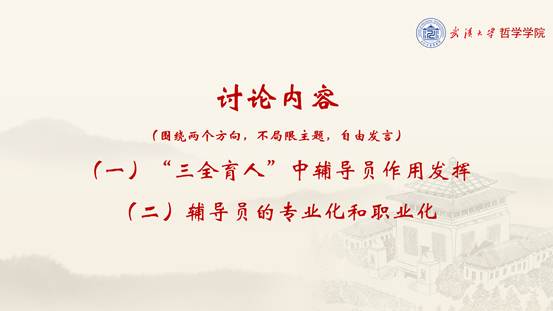 第二个部分是主题讨论,与会老师围绕着“辅导员在‘三全育人’中作用发挥”和“辅导员的专业化和职业化”两个主题踊跃发言,各抒己见,在讨论过程中产生了强烈的共鸣,现场气氛热烈且融洽。