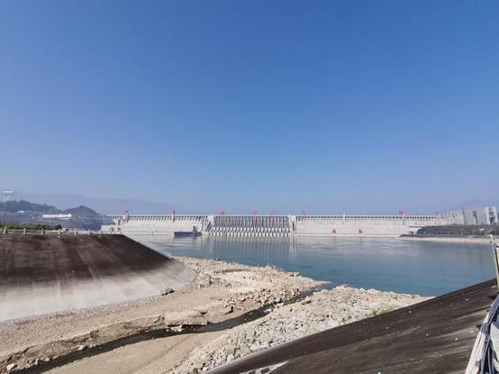 最后,同学们来到了截流纪念园。在园中陆续参观了石料仓、地下廊道入口和截流记事墙,并在最佳观坝广场上从仰视角度观览三峡大坝。和缓的江水仿佛是静止的油画,与远处的蓝天融为一体,同学们可谓是切身体验了王勃笔下“秋水共长天一色”的意境之美。