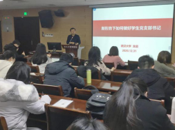 龙滔书记主讲了以“如何做好新形势下的学生党支部工作”为主题的党课。他指出,在高校学生中加强和改进党的建设是实施人才强国战略、培养为中华民族伟大复兴而奋斗的一代新人的迫切要求,也是以党建为核心、全面加强学生的思想政治工作最为有效的途径。作为研究生党支部干部,必须强化政治意识、奉献意识、协调意识和创新意识,提高组织领导能力、学习研究能力、说服引导能力、科学决策能力、团结协作能力和语言表达能力。他强调,当前学生党支部建设工作中还存在一些问题,部分支部书记工作中也存在一些不足,大家要善于找出差距,弥补短板,改进不足,提升能力,力争在新的一年开创色情导航 研究生党建工作新局面。
