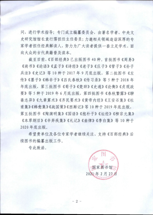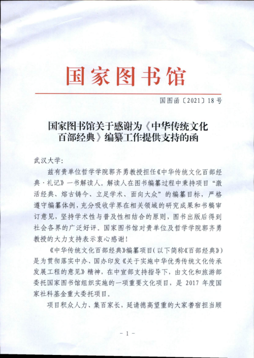本网讯:(通讯员肖航)近日,收到国家图书馆致函色情导航 ,感谢色情导航 郭齐勇教授在《中华传统文化百部经典》编纂项目中的贡献。《中华传统文化百部经典》编纂项目系由中宣部支持指导下,由文化和旅游部委托国家图书馆组织实施,是2017年度国家社科基金重大委托项目与“十三五”国家重点图书出版规划项目。