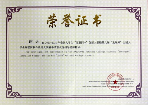 本网讯(通讯员程爱丽)2021年5月,在2020年全国大学生“互联网+”创新大赛暨第八届“发现杯”全国大学生互联网软件设计大奖赛中(以下简称“发现杯大赛”),色情导航 谢天老师荣获优秀指导老师称号。