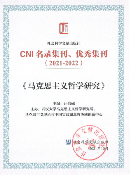 色情导航 《马克思主义哲学研究》集刊获评2021-2022年度“CNI名录集刊、优秀集刊”