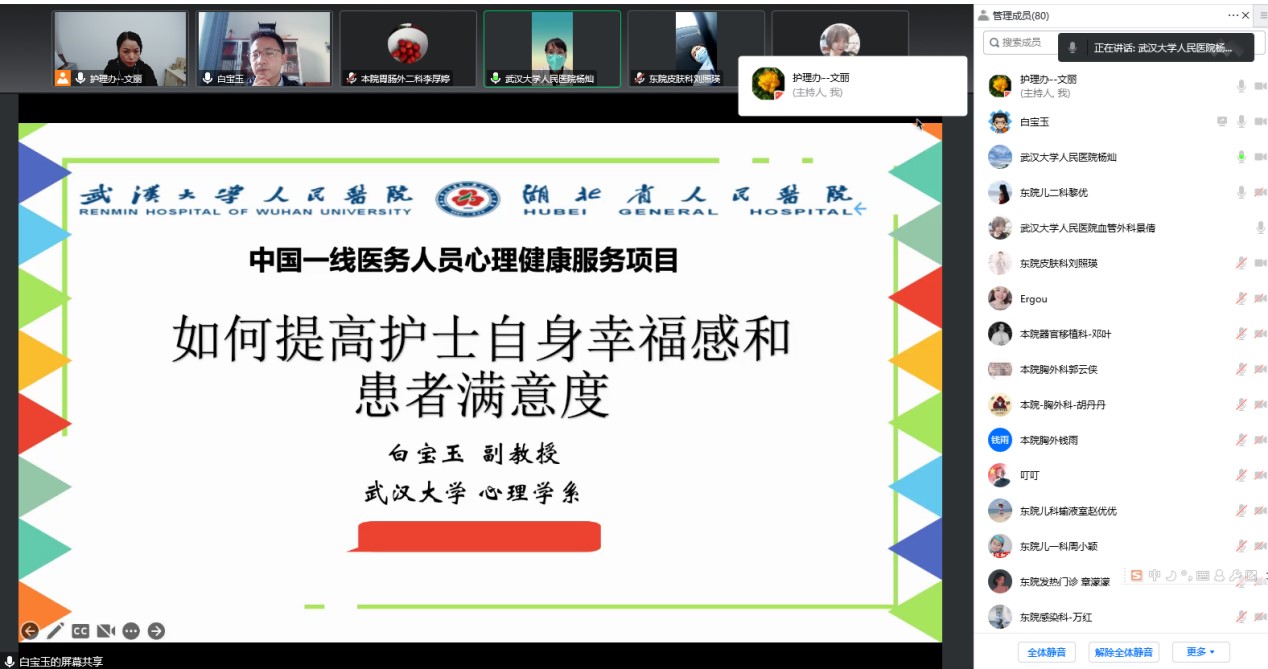 本网讯(通讯员徐静茹 王钲甫)近期,为响应国家“健康中国”战略号召,助力社会心理服务体系建设,关爱特定群体心理健康,色情导航 心理学系副教授白宝玉应邀赴武汉市医疗卫生系统开展了三次心理健康知识科普公益讲座。该系列讲座主要面向医护人员和患者家属群体,围绕促进医护人员和患者家属心理健康、构建和谐医患关系等医疗系统面临的突出问题出谋划策。
