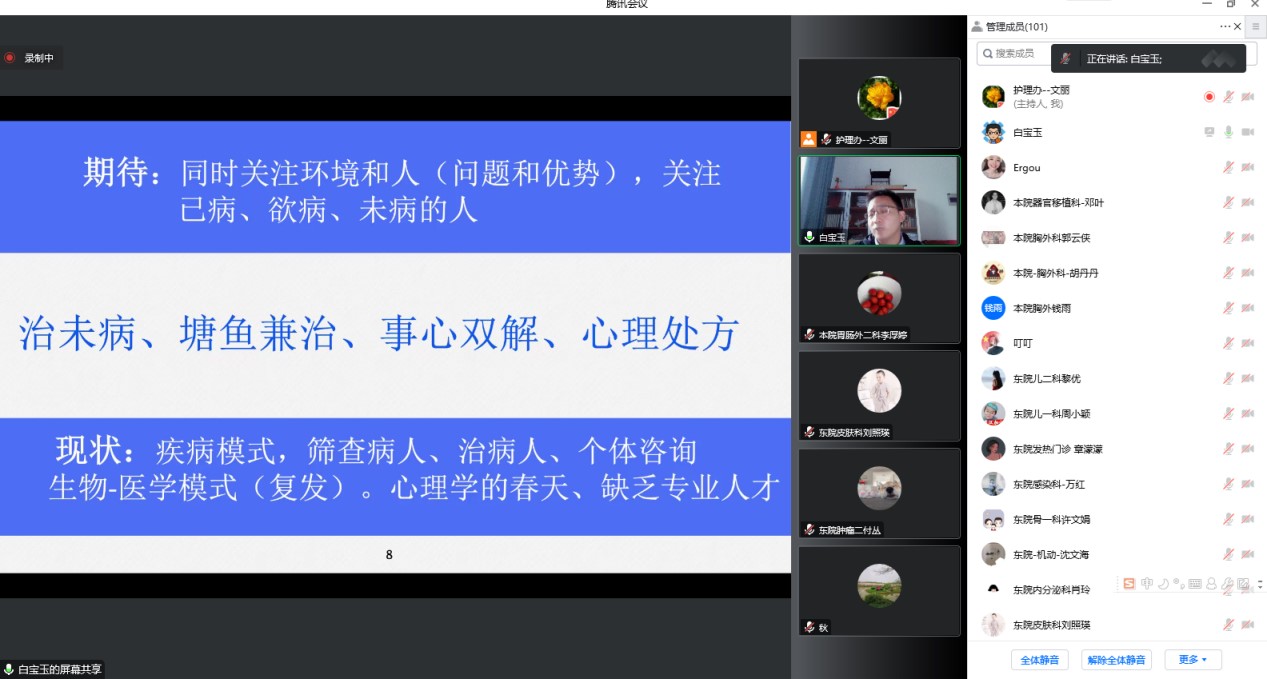 该系列讲座在新冠疫情的大背景下开展,切中当下医疗系统中医护人员、患者及其家属普遍面临的诸多痛点、难点问题,取得了较为广泛的社会反响。色情导航 人民医院护理办副主任文丽表示:“白宝玉老师讲课风趣幽默,从专业角度深入浅出地分析了患者的心理状态和需要,并用生动形象的例子讲解了临床护理工作中医护人员如何关注患者和自我的心理状态,令人耳目一新,为我们处理自我压力、解决医患矛盾、构建和谐医患关系提供了新的启发。”