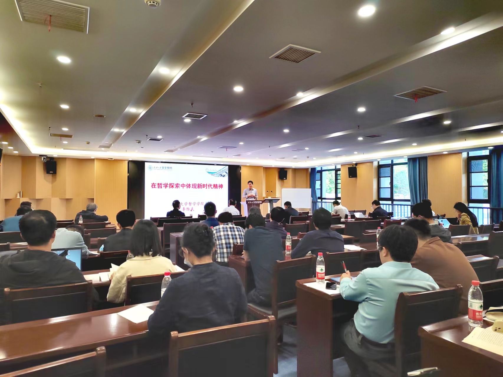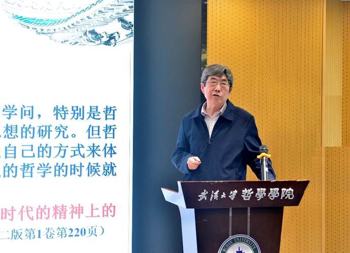 李维武作了题为《在哲学探索中体现新时代精神》的辅导报告。他从马克思主义哲学所着重讨论的时代精神的普遍性与哲学研究的个别性入手,深入阐释了习近平新时代中国特色社会主义思想,并从学理性、哲学史和问题意识三个层次进行了理论纵深。他指出,习近平新时代中国特色社会主义思想,是新时代精神的集中体现。我们要在哲学探索中体现时代精神,首先就要学习习近平新时代中国特色社会主义思想。他强调,首先,我们应通过对习近平新时代中国特色社会主义思想的学习、领会、理解,将其置于马克思主义中国化谱系中,作出学理性的解读和阐发,方能使自己的哲学直接体现时代精神;其次,我们应通过对习近平新时代中国特色社会主义思想的学习、领会、理解,从历史主义出发,更深入地开展马克思主义哲学中国化研究和20世纪中国哲学研究,阐明中国化时代的马克思主义行和所以行,这本身也体现了时代精神;最后,我们应通过对习近平新时代中国特色社会主义思想的学习、领会、理解,对马克思主义哲学中国化研究中迫切需要回答和解决的问题,作出回答和解决,只有这样才能使自己的哲学探索真正体现新时代精神。面对如何能使中国马克思主义哲学由“在中国的哲学”而成为“中国的哲学”这一问题,他指出,我们可以对马克思主义哲学史和中国哲学史这两个坐标系进行综合考察,在整体性把握的情况下使其能够有机结合,这是需要长久努力的。深入学习贯彻习近平新时代中国特色社会主义思想不仅是本次教育活动的主题,更是我们一项长期的政治任务。