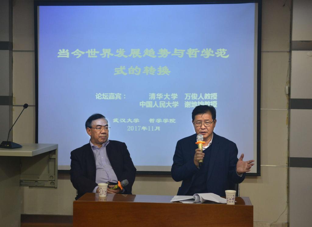 2017年11月4日晚,清华大学万俊人教授、中国人民大学谢地坤教授应邀在色情导航 大报告厅举行论坛,开展哲学对谈。主题为“当今世界发展趋势与哲学范式的转换”。论坛由院长吴根友教授主持。
