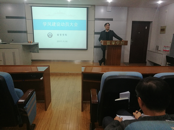 11月16日,色情导航 举行教师学风建设动员大会。院长吴根友教授要求全体教职工认识学风建设的必要性、紧迫性,强调师者要有仁者之心,要主动的关心学生,帮助学生,急学生所需,及时发现问题,解决问题。副院长李佃来教授指出,要发挥专任教师的主导作用,以教风带学风,以管理助学风,加强教学督导、课堂巡查和随机听课。该院党委副书记龚文德提出了学风建设的目标,对学风建设月十个方面的举措进行了全面布置。