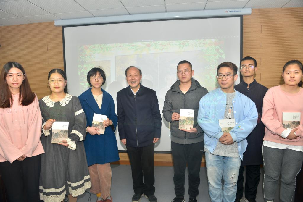 讲座结束后,郭老师为国学班的同学们颁发了亲笔签名的新作《中国人的智慧》,并与学生代表合影。