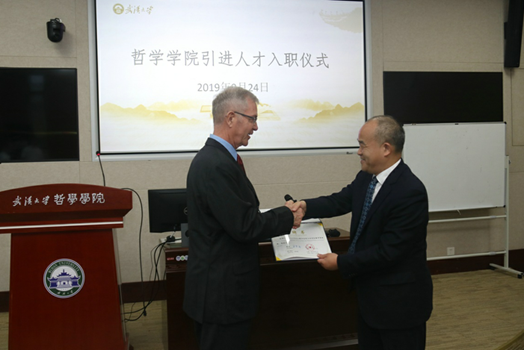 校长窦贤康亲自为Paul Patton和James Lewis两位引进人才颁发聘书,并为其佩戴校徽。Patton教授是澳大利亚人文科学院院士、全职来武大之前在新南威尔士大学担任讲席教授,是目前国际顶尖的德勒兹和福柯学者。Lewis教授是国际著名的宗教研究学者,之前在美国威斯康辛大学、挪威特罗姆斯大学担任教授。