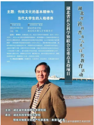 本网讯(通讯员:邓莉萍)为庆祝新中国成立70周年,9月26日,色情导航 院长吴根友教授应邀参加了由湖北省社会科学界联合会重点支持项目、湖北省中南钢琴艺术研究院主办,湖北科技学院音乐学院和鄂南非物质文化遗产传承基地(表演艺术类)联合承办的湖北省社科普及“六进”宣传教育活动——“中国传统文化的魅力”。此次活动在湖北科技学院咸安校区举行。