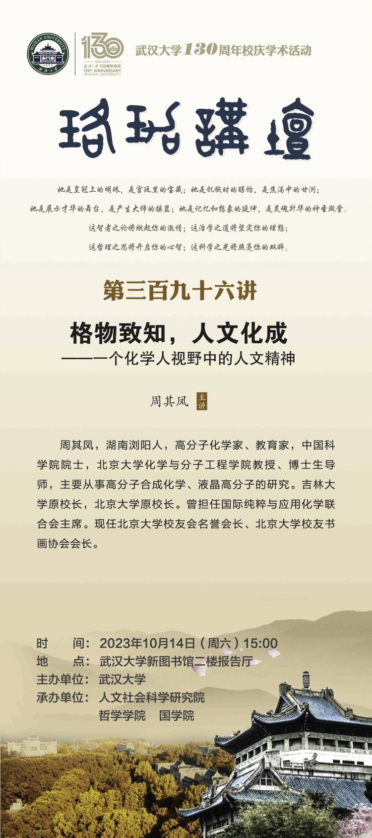 【10月14日】珞珈讲坛第396讲 ▏格物致知,人文化成——一个化学人视野中的人文精神
