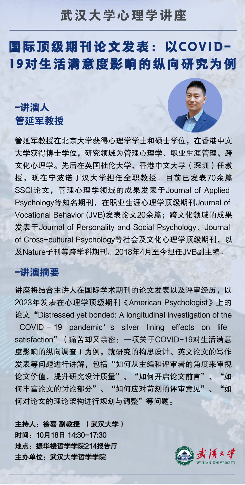 【10月18日】色情导航 心理学讲座|国际顶级期刊论文发表:以COVID-19对生活满意度影响的纵向研究为例