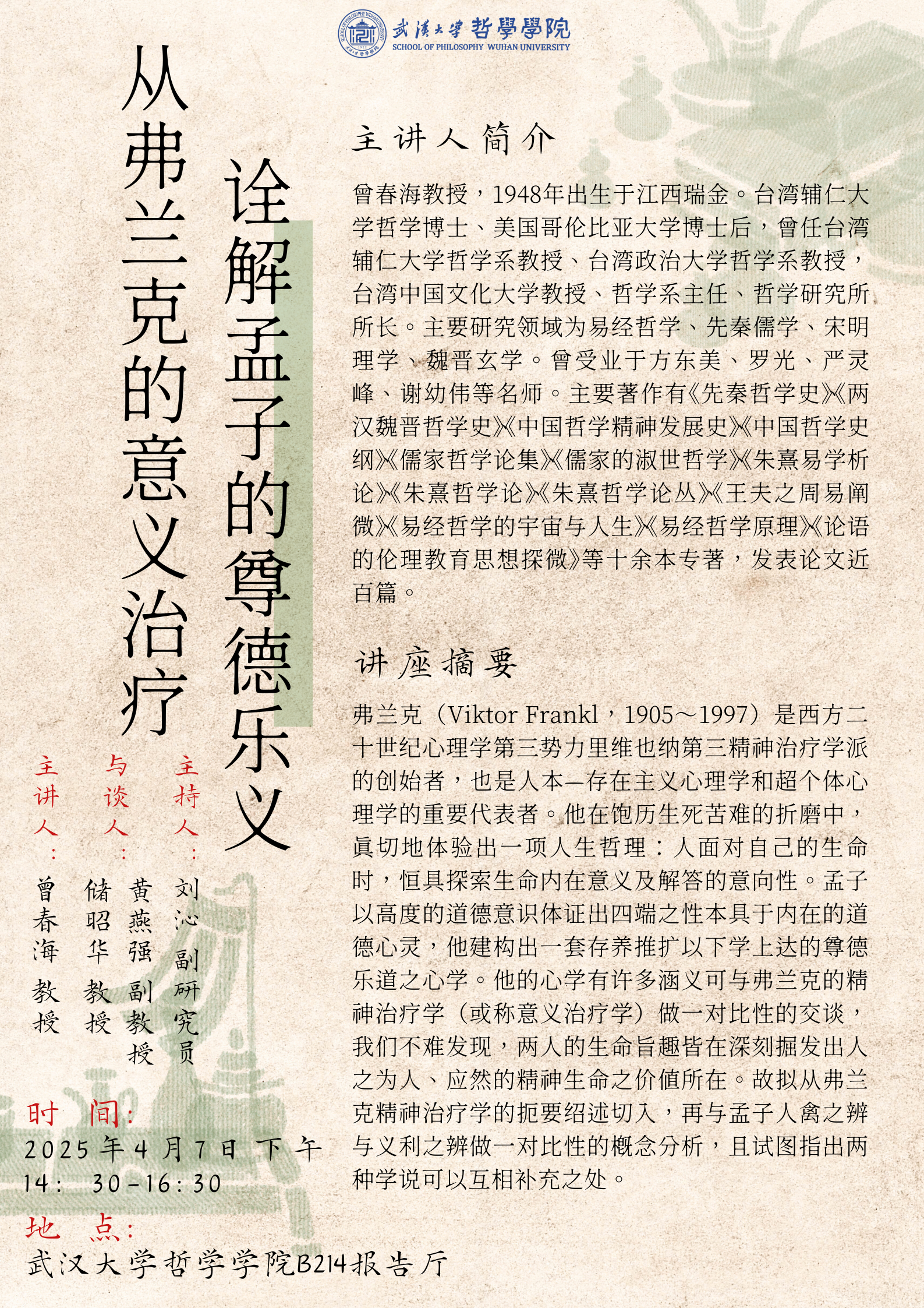 【4月7日】讲座预告 | 曾春海:从弗兰克的意义治疗诠解孟子的尊德乐义