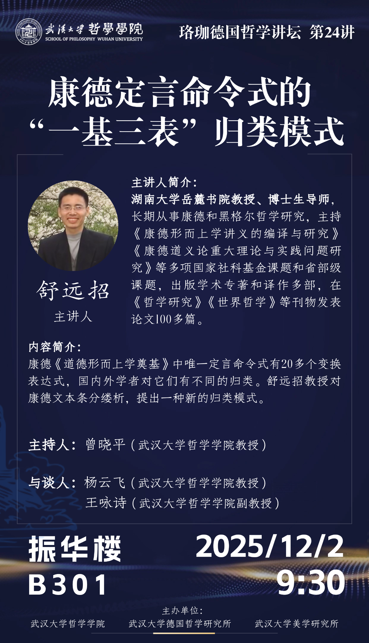 【12月2日】珞珈德国哲学讲坛第24讲 | 舒远招:康德定言命令式的“一基三表”归类模式