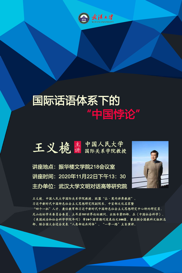 王义桅,中国人民大学欧盟“让·莫内讲席”教授,习近平新时代中国特色社会主义思想研究院副院长,国际关系学院博士生导师,中宣部文化名家暨“四个一批”人才,兼任教育部习近平新时代中国特色社会主义思想研究中心特约研究员,尼山论坛学术委员会委员、土耳其TRT世界论坛顾问。先后毕业于华东理工大学环境工程系、复旦大学国际政治系,获工学学士,法学硕士、博士学位,担任天津联合化学有限公司助理工程师、复旦大学美国研究中心教授、美国耶鲁大学福克斯学者,韩国延世大学访问教授,中国驻欧盟使团外交官、同济大学特聘教授兼国际与公共事务研究院执行院长。出版专著《世俗文明的终极关怀:人类命运共同体的逻辑》、《世界之问、中国之答:人类命运共同体》、《国之交如何民相亲:新时代中国公共外交之道》、《海殇?——欧洲文明启示录》等25部,其中《一带一路:机遇与挑战》、《世界是通的——“一带一路”的逻辑》连获2015、2016年“中国好书”,被译成20多种文字出版,译著《大国政治的悲剧》等3部;主编“中国北约研究丛书”(10卷本),在《中国社会科学》、《美国政治和社会科学学院年刊》等20个国家期刊发表论文300篇,曾在联合国教科文组织总部、联合国大会边会发表“人类命运共同体”、“一带一路”主旨演讲。