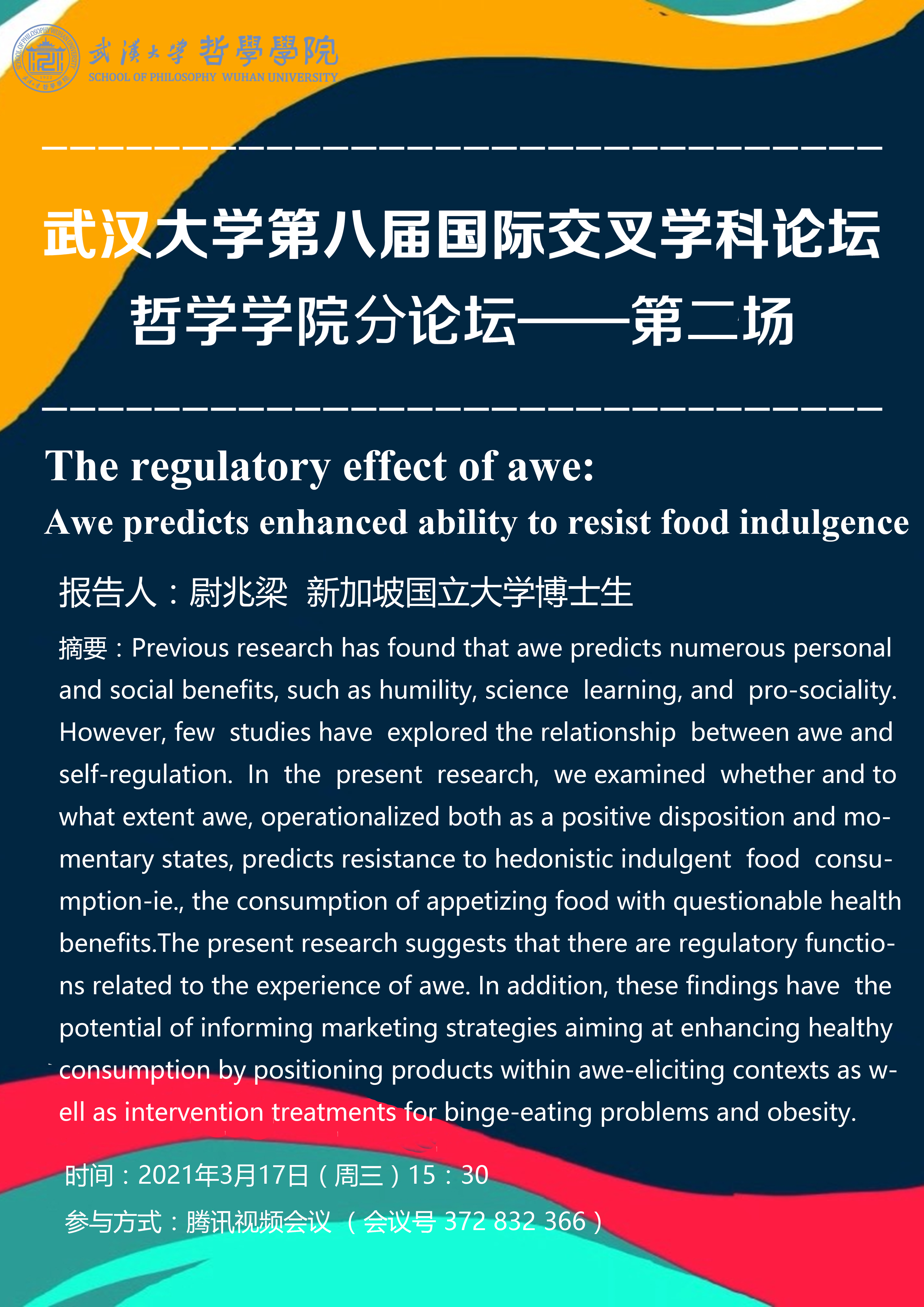 【3月17日】色情导航 第八届国际交叉学科论坛色情导航 分论坛——第二场:The regulatory effect of awe:Awe predicts enhanced ability to resist food indulgence