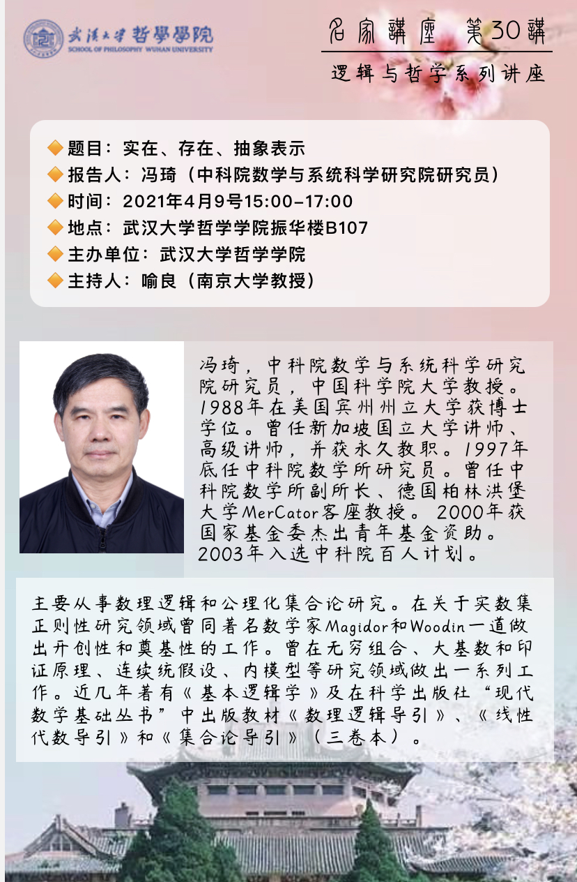 【4月9日】名家讲座第30讲:“实在、存在、抽象表示”——逻辑与哲学系列讲座