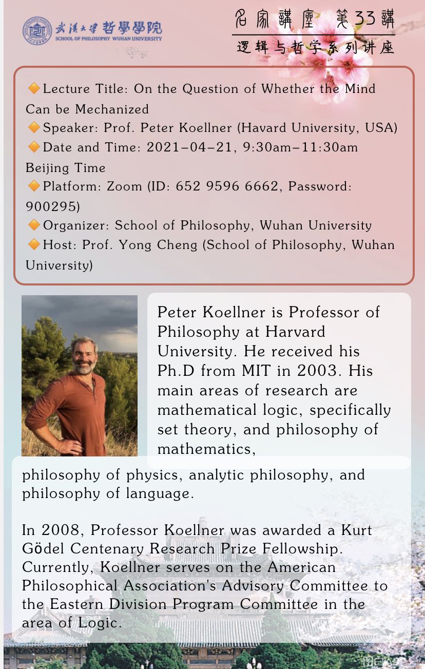 【4月21日】名家讲座第33讲:“On the Question of Whether the Mind Can be Mechanized”——逻辑与哲学系列讲座