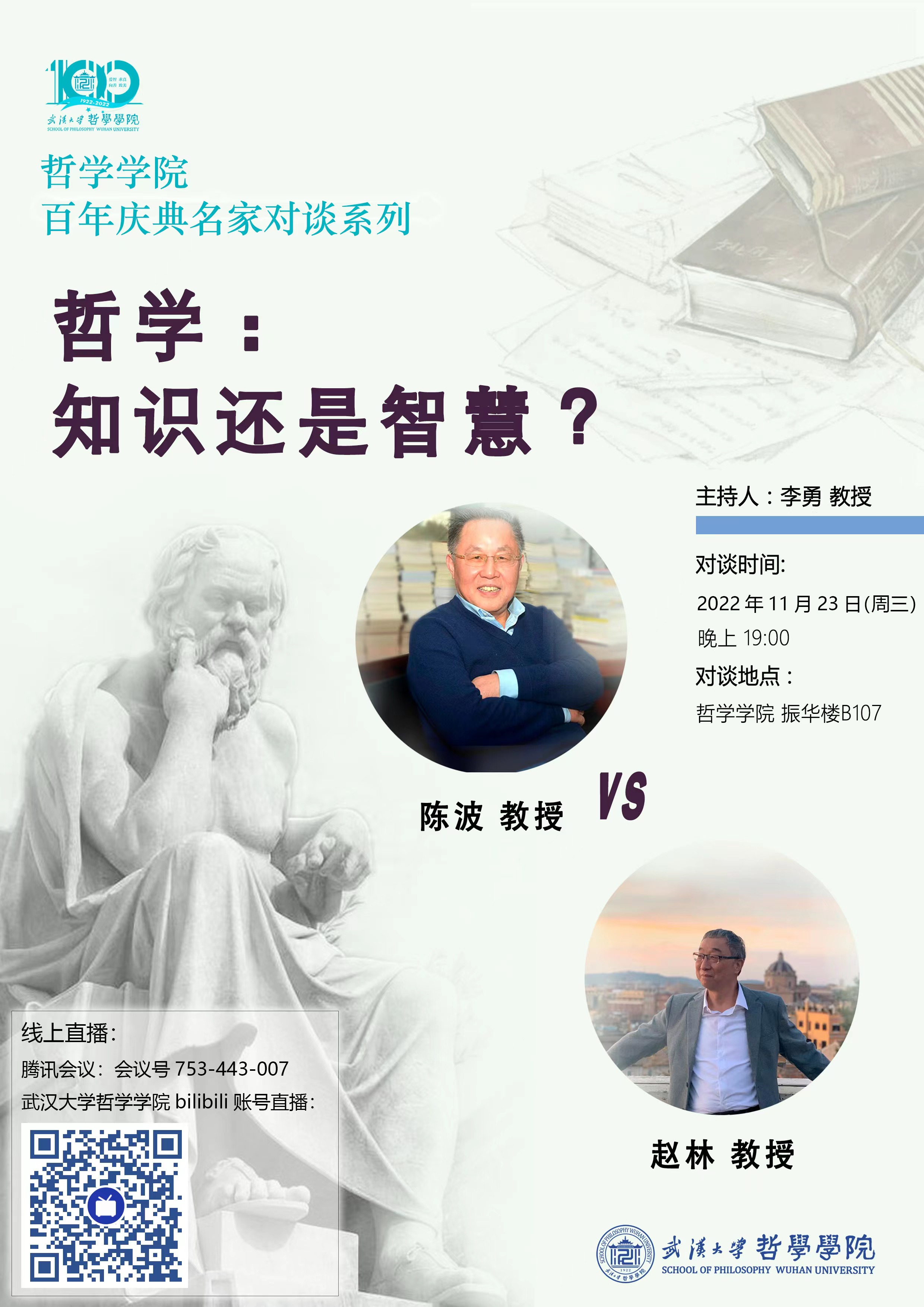 日晚,由赵林老师和陈波老师主讲的“哲学:知识还是智慧?”对谈改期进行。具体日程安排,后续发布。敬请谅解。