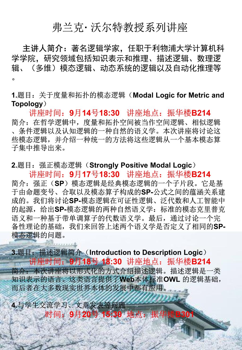 【9月14日——20日】弗兰克· 沃尔特教授系列讲座