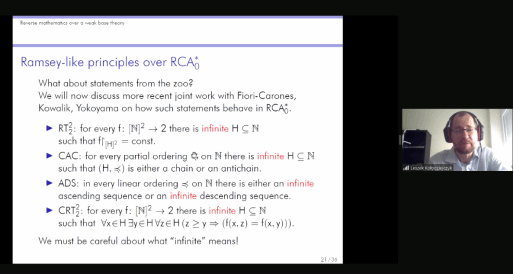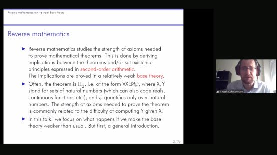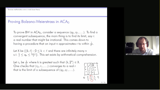 为了使听众进一步了解反推数学,Kołodziejczyk教授对二阶算术进行了简要的介绍。Kołodziejczyk教授指出,所有的通常的实际的数学都可以在全二阶算术Z2中形式化,对于反推数学而言Z2过强了,因此我们通常通过限制内涵公理和归纳公理到某一类集合上考虑其较弱的子系统。当我们将其限制在一阶算术可定义集上我们就得到了ACA0,将内涵公理限制在可计算集上,归纳公理限制在可计算枚举性质上我们就得到了RCA0。为了演示反推数学的一般研究方法,Kołodziejczyk教授向听众介绍了一个简单的例子:在RCA0上有理数列的Bolzano-Weierstrass定理和ACA0等价。而另一个重要的系统WKL0的强度介于RCA0和ACA0之间。但另一方面,反推数学的研究发现,存在一些复杂的数学定理,其强度介于RCA0和ACA0之间,但却与WKL0不可比,并且其彼此之间的强度也不可比。几个Ramsey型原则即是典型的例子。