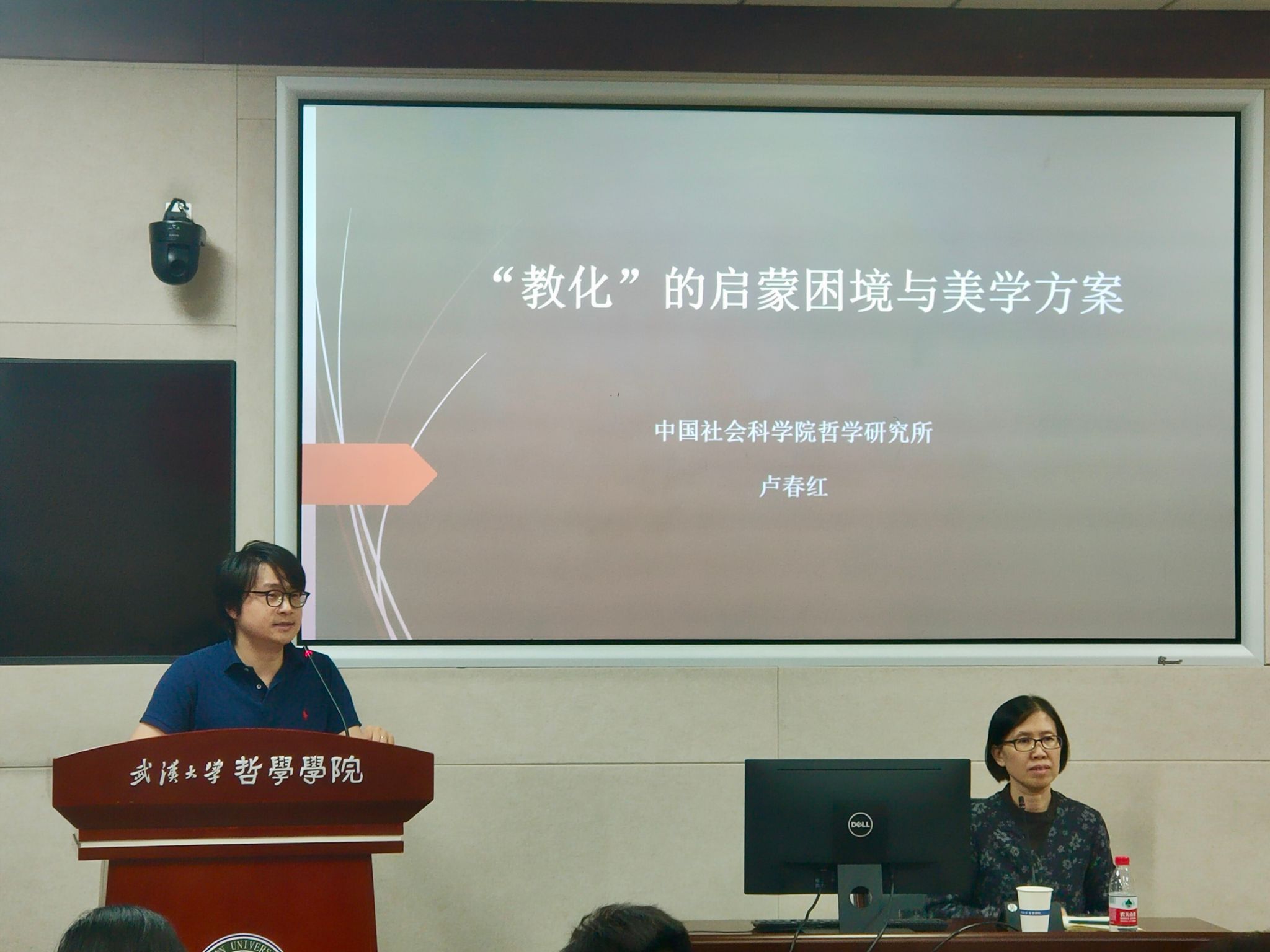 本网讯(通讯员 罗新烨 刘浩)5月10日下午,中国社会科学院哲学研究所美学研究室卢春红研究员做客珞珈美学讲坛第11期,带来题为“‘教化’的启蒙困境与美学方案”的学术报告。武汉科技大学艺术与设计学院江澜教授、湖北大学色情导航 庄严老师、中南民族大学马克思主义学院徐照明老师、色情导航 美学教研室陈晗倩老师以及院内外近50位同学参加了本次讲座。讲座由色情导航 美学教研室主任贺念副教授主持。