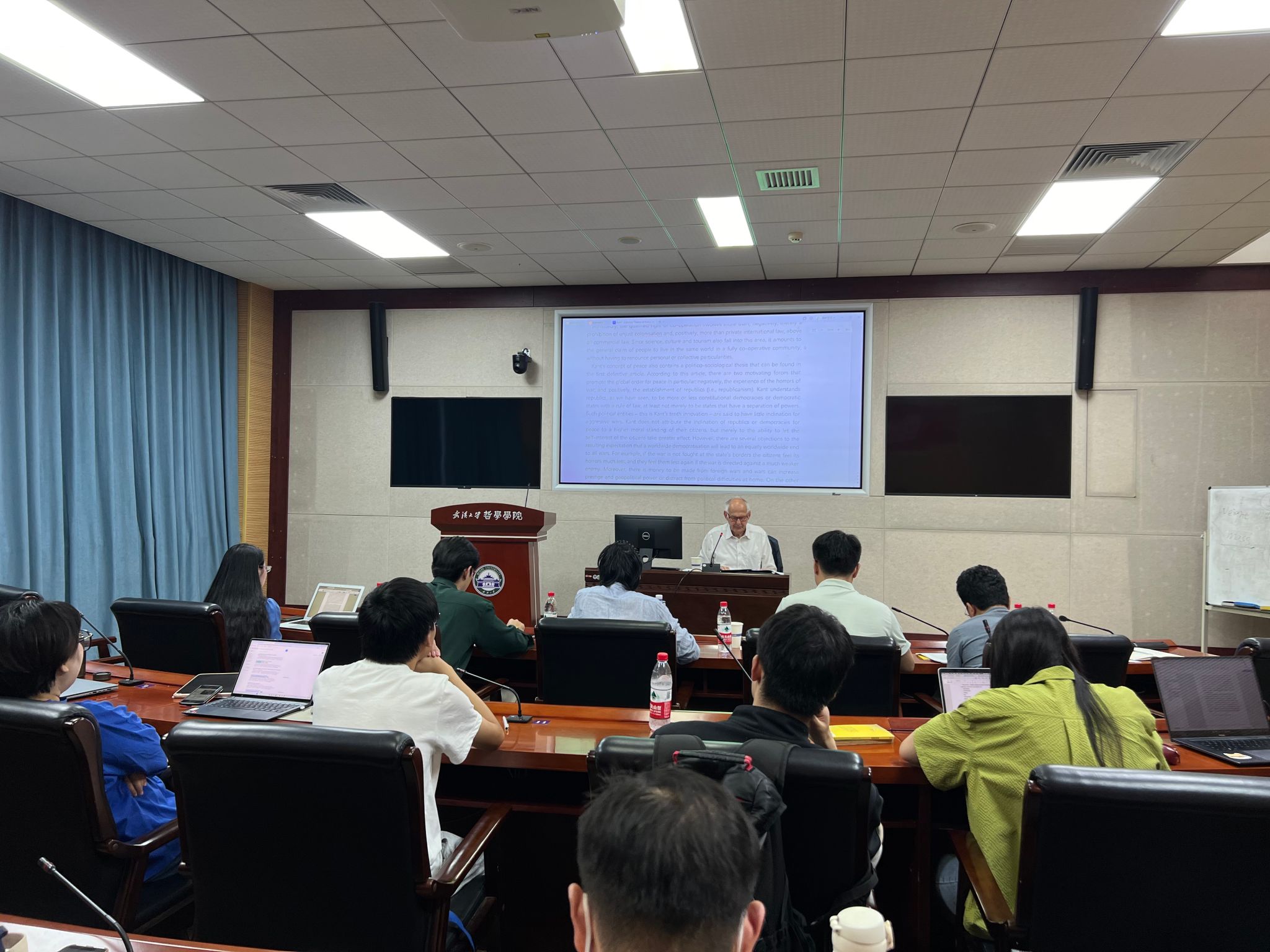 互动环节,就张广副教授、袁辉副教授、贺念副教授及在场同学们提出的“为什么和平对当代世界而言显得比康德时代更困难?”、“在‘祛魅’时代,一种建立在目的论历史哲学基础上的和平理论还有吸引力吗?”、“康德哲学中‘明智’的不同含义”、“‘世界共和国’是否应被授予强制权限?”、“道德化与文明化的联系和区别”等问题,赫费教授一一作出回应,细致谈论了自己对这些问题的看法。