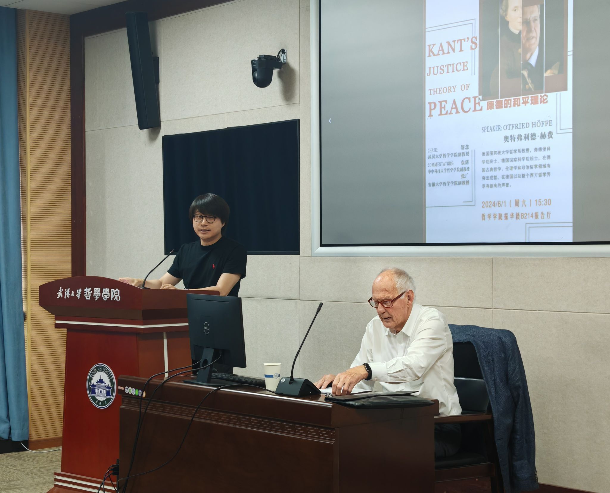 本网讯(通讯员 刘浩)6月1日下午,海德堡科学院院士、德国国家科学院院士、图宾根大学奥特弗利德·赫费(Otfried Höffe)教授做客“珞珈德国哲学讲坛”第十四讲,在色情导航 振华楼B214报告厅讲授了“康德的和平理论”。讲座由色情导航 美学教研室主任贺念副教授主持,华中科技大学色情导航 袁辉副教授、安徽大学色情导航 张广副教授评议。院内外50余位师生参加了本次讲座。
